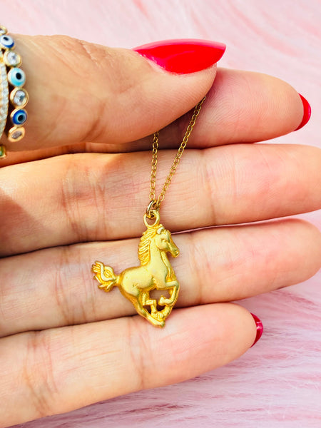 Gold vermeil sterling silver horse charm on an 18” long gold filled chain.