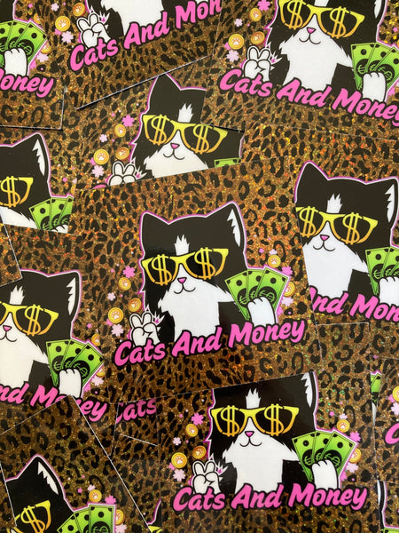 Cats And Money kitty on a glittery cheetah print background.