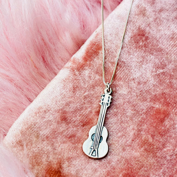 Sterling silver guitar charm on an 18” long sterling silver chain.